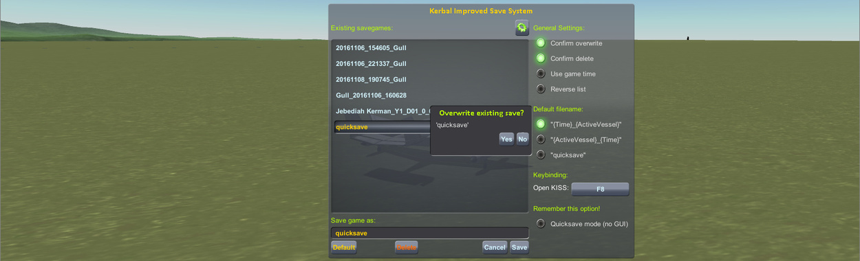 | Abstract | KISS is a small plugin for KSP that provides an improved "Save game as..." mechanic while in flight. KISS allows you to overwrite or create a variation of a previous quicksave without the need to memorize quicksave names and without having to type the full name every time! |